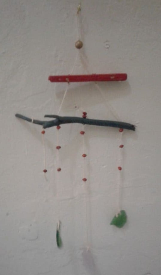 This product is made out of driftwood, coconut shells, thin rope, and natural red seeds. There is also an option utilizing sea glass. You can choose to have the words Peace, Love, and Joy painted in English on one side and Haitian Creole on the other side, or you can choose to leave it blank.